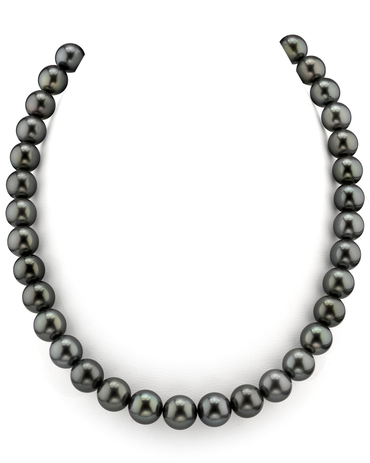 The AAAA quality Tahitian Pearl Necklace features True-Round Tahitian pearls. Each pearl is individually double-knotted on matching black silk and finished with a gold clasp of your choice.