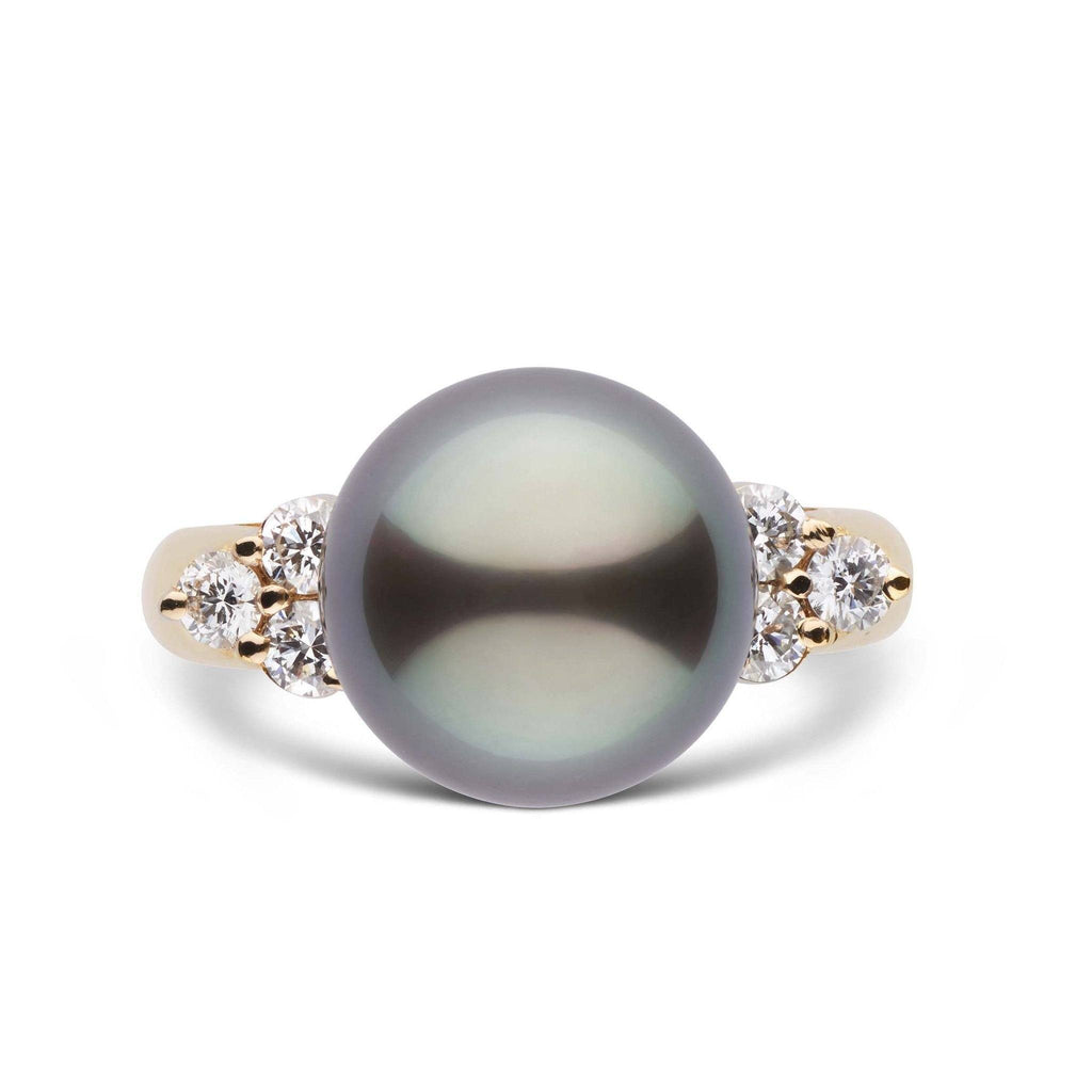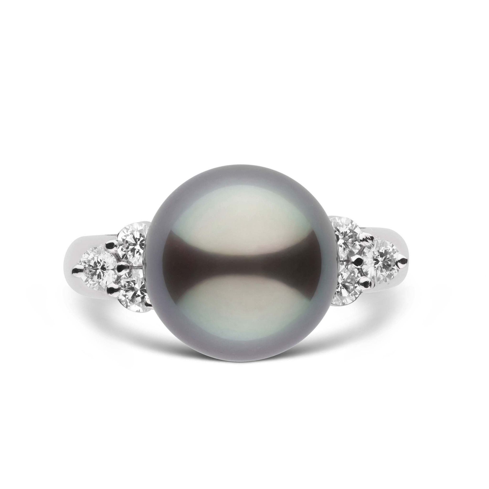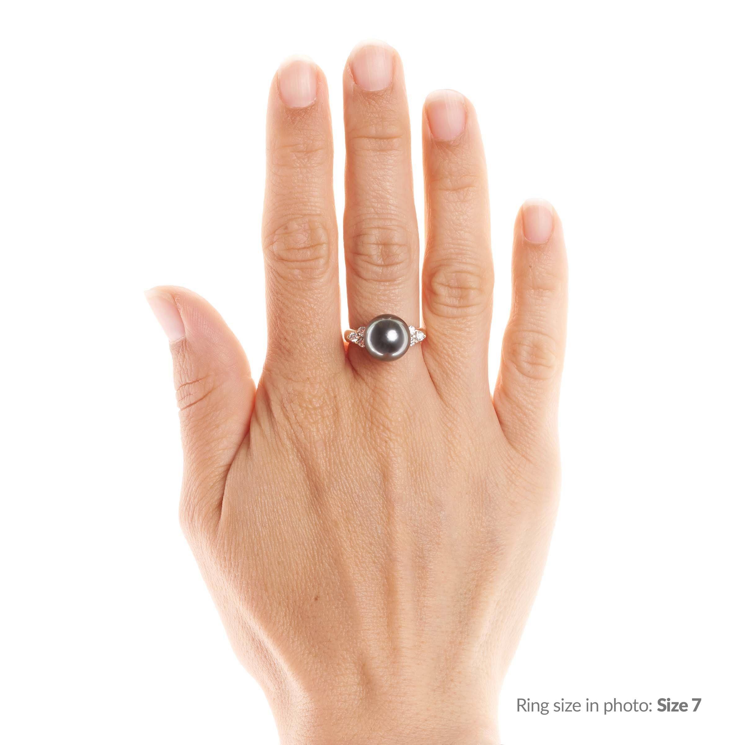 This stunning ring boasts six round-cut sparkling diamonds with a total carat weight of 0.30. Nestled between the two sets of three diamonds is a perfectly round, flawless 11.0-12.0 mm Tahitian pearl. The sparkle of the diamonds complements the pearl's mirror-like luster and exotic natural color.