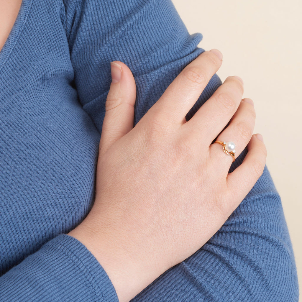 Nestled in a graceful tiara-inspired setting, the center pearl is elegantly accented by 0.06 carats of VS1-G rated diamonds — a superior clarity and color typically reserved for fine solitaire pieces. Each diamond is hand-set to enhance the natural beauty and glow of the pearl.